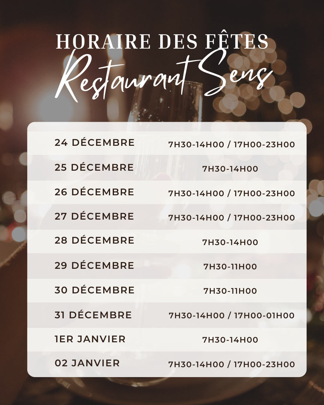 LUNDI-VENDREDI 06h30 à 10h00 / 11h30 à 22h00 SAMEDI 07h30 à 13h00 / 17h00 à 22h00 DIMANCHE 07h30 à 13h00